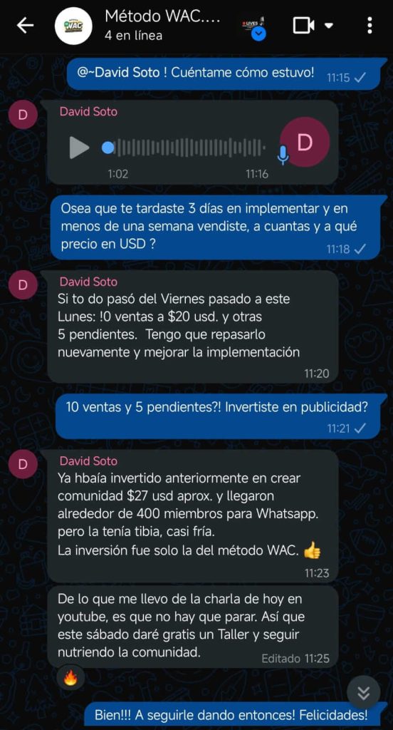 El Método WAC es la síntesis de todo lo que he aprendido y ejecutado: un sistema práctico para revivir tu comunidad, activar la atención y vender con audios estratégicos en WhatsApp, sin páginas web, sin funnels costosos y sin enredos técnicos.